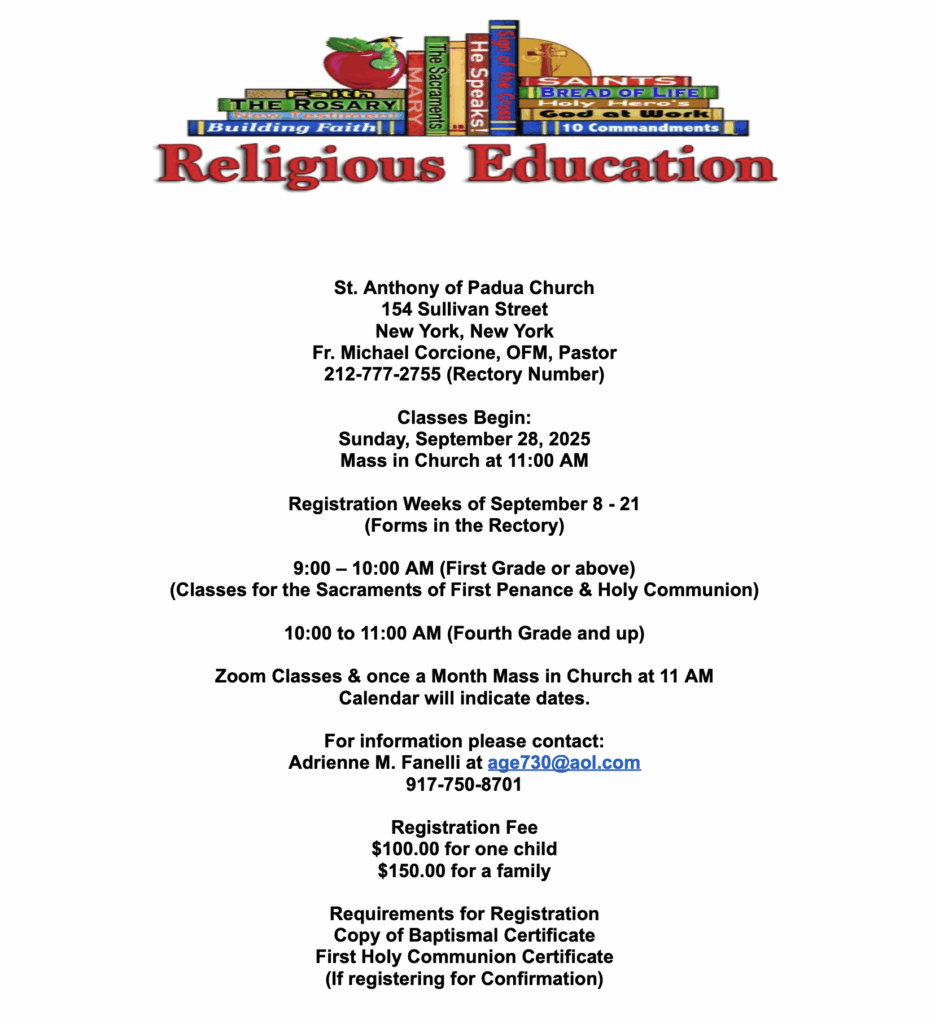 Religious Education is offered for children from 1st to 8th grade, including preparation for First Penance, First Eucharist, and Confirmation. For more information, contact Adrienne M. Fanelli at 917-750-8701 or the Parish Office at (212) 777-2755.
